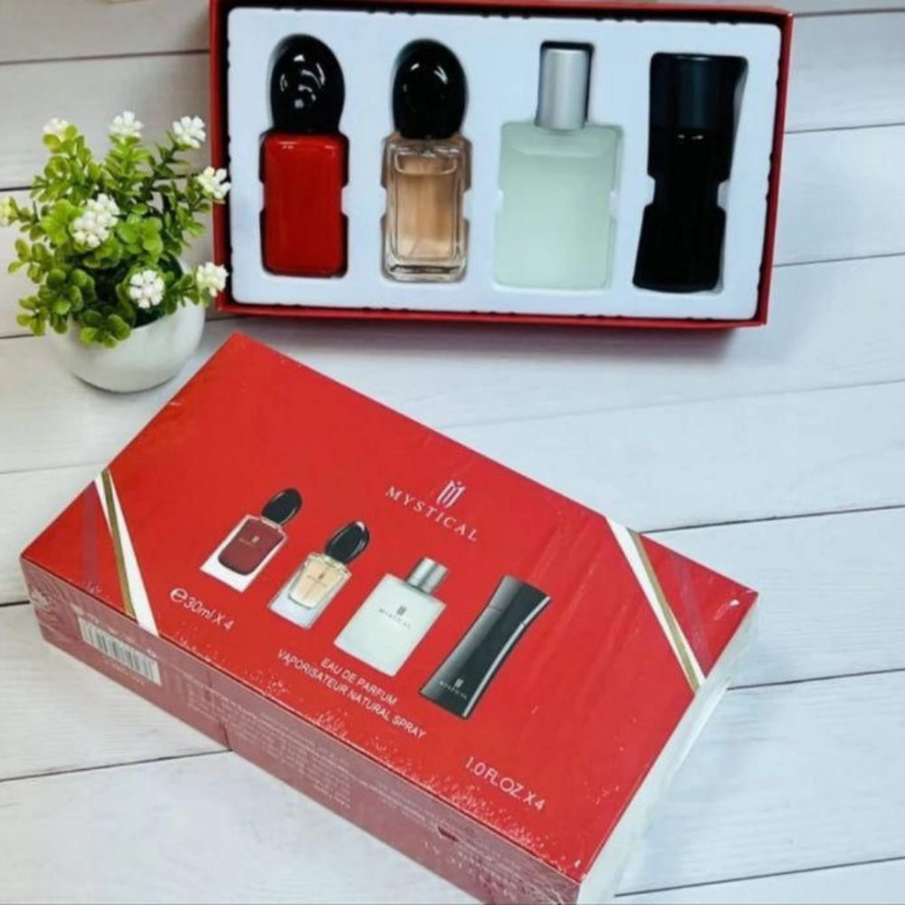 علبة هدايا أنيقة من MYSTICAL تحتوي على مجموعة عطور فاخرة من ماركة ، معروضة في علبة فاخرة