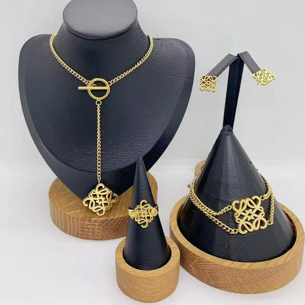 تتألق هذه المجموعة الفاخرة بالتفاصيل المتشابكة المستوحاة من شعار Loewe، حيث تأتي القلادة بتصميم عصري مع قفل دائري أنيق وسلسلة متدلية تضفي لمسة راقية. كما تتكامل الأقراط، السوار، والخاتم مع التصميم، مما يمنحك إطلالة متناغمة وفاخرة تناسب جميع المناسبات.