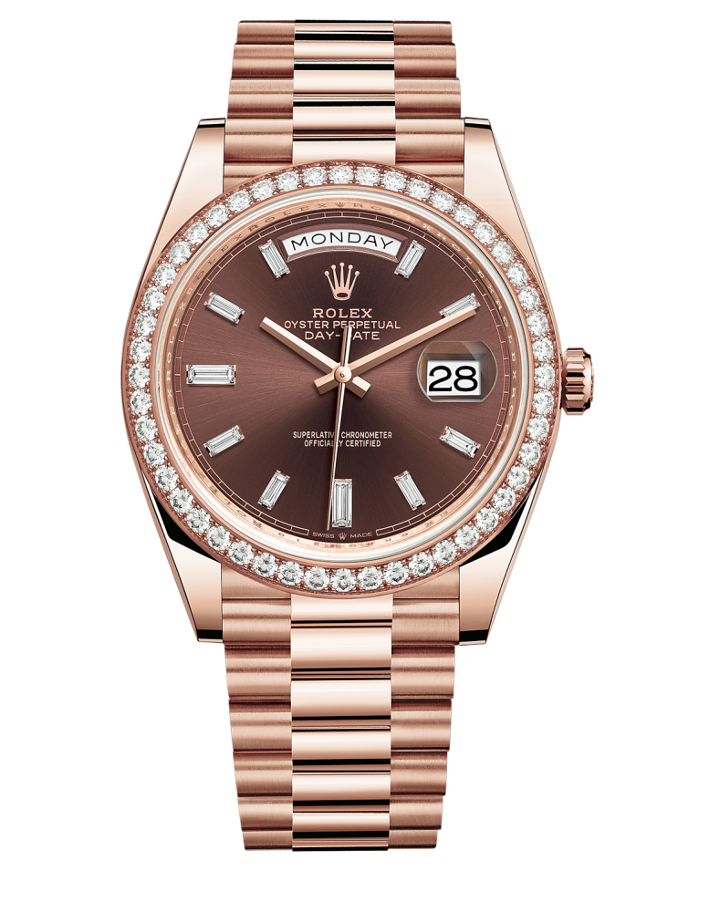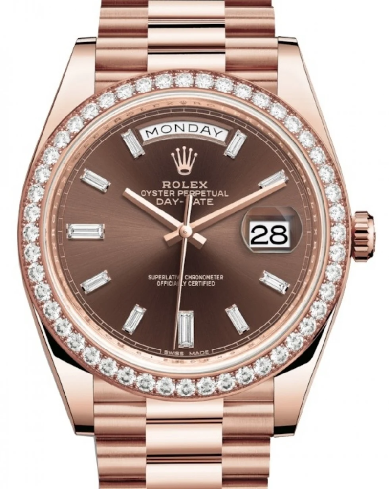 ساعة رولكس داي ديت ٤٠ من الذهب الوردي، مينا ألماس شوكولاتة، وإطار ألماس، سوار بريزيدنت ٢٢٨٣٤٥rbr - RLX