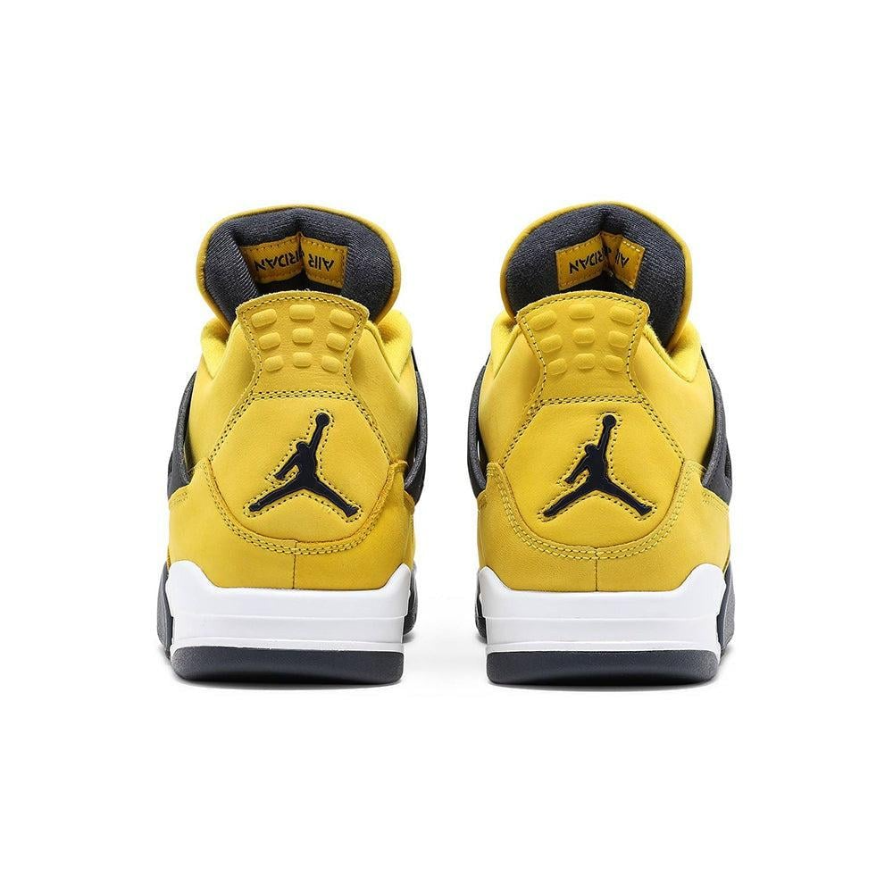 يعيد إصدار 2021 من Air Jordan 4 Retro 'Lightning' إحياء مسار الألوان المرغوب فيه للغاية والذي تم إطلاقه في الأصل في عام 2006 جنبًا إلى جنب مع مسار الألوان المصاحب "Thunder"، وكلاهما مستوحى من فريق رياضة السيارات التابع لمايكل جوردان. يغمر لون أصفر ساطع الجزء العلوي من جلد النوبوك، ويتناقض مع الشبكة السوداء والأجنحة الهيكلية ذات اللون الرمادي الداكن. لمسات رمادية متطابقة تهبط على علامة اللسان المنسوجة واللسان الداخلي وعلامة Jumpman التجارية على الكعب. نعل أوسط من البولي يوريثان باللون الأبيض، معزز ببطانة نعل هوائي مرئية، ويرتكز على نعل خارجي مطاطي متعرج باللون الرمادي الداكن.