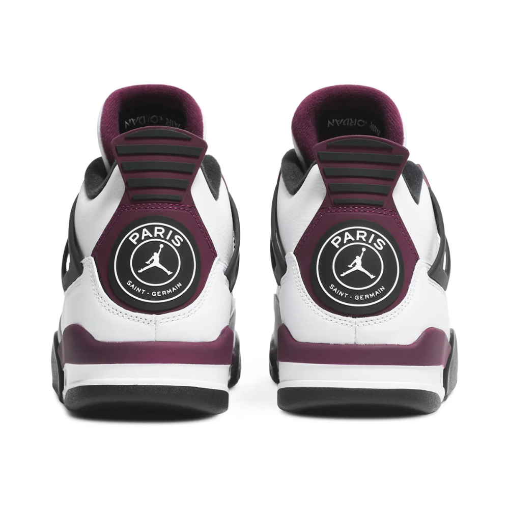احتفالاً بشراكة علامة Jordan التجارية مع نادي كرة القدم الفرنسي، يتميز حذاء Paris Saint-Germain x Air Jordan 4 Retro "Bordeaux" بتكتلات الألوان التي تذكرنا بتكوين "Fire Red" الأصلي للصورة الظلية. يتميز الجزء العلوي المصنوع من الجلد الأبيض بأجنحة سوداء وتفاصيل بوردو على الفتحات واللسان الداخلي والكعب، حيث يتميز الأخير بعلامتي Jumpman وPSG. يوجد على لسان منسوج أسود على مقدمة القدم الجانبية كلمة "Paname"، وهي مصطلح عامي للعاصمة الفرنسية.
