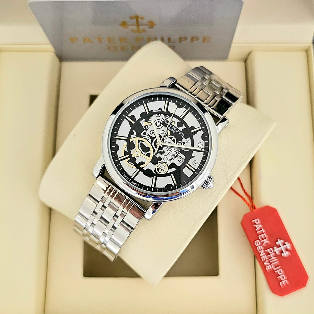 وجه أسود وأبيض مكشوف يعكس دقة صناعة الساعات السويسرية. التفاصيل الحركية مرئية بوضوح، مع سوار معدني كلاسيكي. خيار مثالي لمن يبحث عن التفرد.